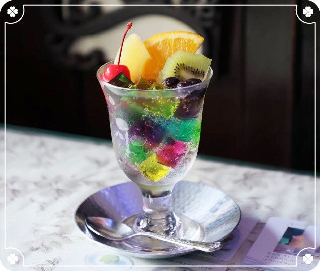 フランス語で“夜会・素敵な夜”を意味する“ソワレ”。店内を青い光が包み、夢見心地な空間が広がります。約50年前から変わらぬレシピで作られるゼリーポンチは、カラフルな見た目とは裏腹に甘さひかえめの大人な味。