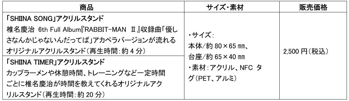 「SHIINA SONG」アクリルスタンド 椎名慶治 6th Full Album『RABBIT-MAN Ⅱ』収録曲「優しさなんかじゃないんだってば」アカペラバージョンが流れるオリジナルアクリルスタンド(再生時間:約4分) 「SHIINA TIMER」アクリルスタンド カップラーメンや休憩時間、トレーニングなど一定時間ごとに椎名慶治が時間を教えてくれるオリジナルアクリルスタンド(再生時間:約20分) | ・サイズ: 本体/約80×65㎜、 台座/約65×40㎜ ・素材:アクリル、NFCタグ(PET、アルミ) | 2,500円(税込) |