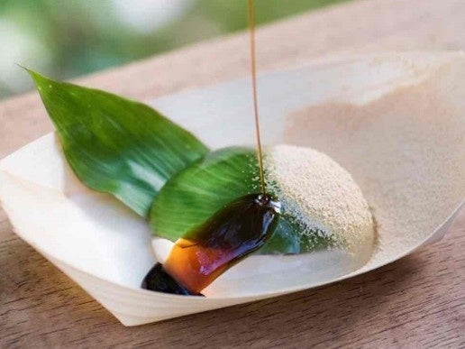 京都伏見稲荷大社近くに本店を構える和菓子店〈まるもち家〉の看板商品。透明の風船を爪楊枝で割るとぷるんぷるんの水まるもちが飛び出します。口に入れた瞬間にとろける、新感覚スイーツ!きな粉と黒蜜が味を際立たせます。