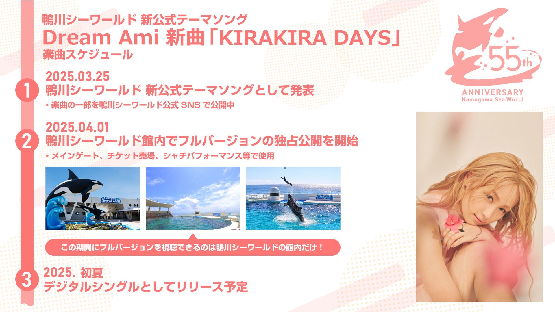 株式会社グランビスタ ホテル&リゾート(本社:東京都千代田区、代表取締役社長:荒井 幸雄)の基幹施設である鴨川シーワールド(千葉県鴨川市、館長:勝俣 浩)では、開業55周年を記念し新公式テーマソングにDream Amiさんが当館のために自ら作詞した「KIRAKIRA DAYS」を起用します。