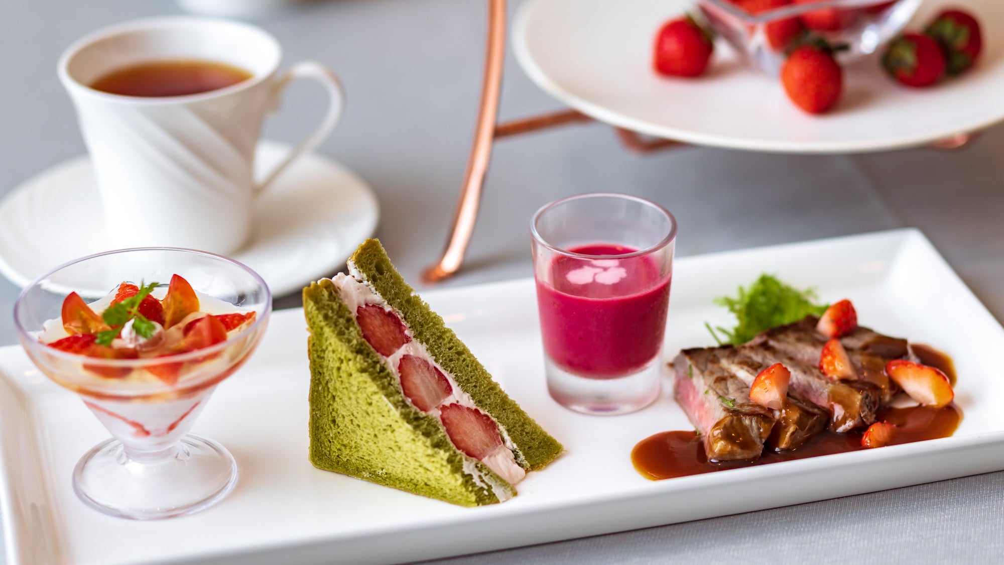 現在、和菓子の伝統を大切にしながらも、フォトジェニックな見た目の「Neo和菓子」が、若い世代を中心に注目されています。毎年人気のストロベリーアフタヌーンティーに、今年はNeo和菓子を取り入れたメニューをご用意いたしました。パフェをまるっと求肥で包んだようなパフェ大福やいちごの断面がポップで可愛らしいいちご柚子寒天、ハート形の最中にクリームチーズといちごがサンドされたいちごクリームチーズ最中など、魅力的なNeo和菓子を見た目でもお楽しみいただけます。セイボリーには抹茶風味のパン生地でいちごをサンドしたフルーツサンド、甘酸っぱいベリーソースと楽しめる牛サーロインソテーをご用意いたしました。