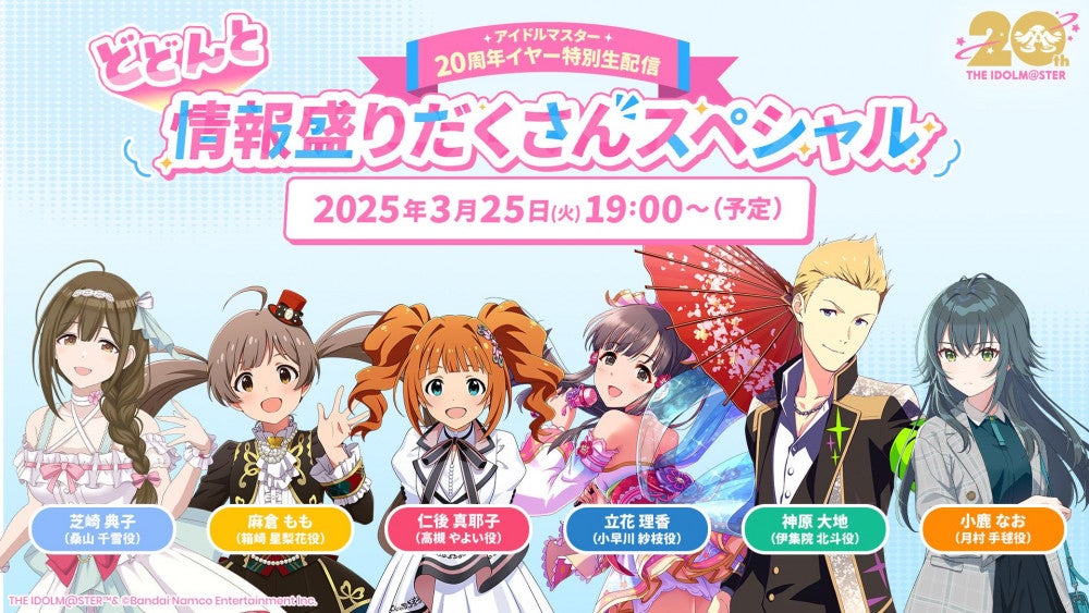 2025年3月25日(火)19時より、「アイドルマスター20周年イヤー特別生配信~3月もどどんと情報盛りだくさんスペシャル~」を配信いたします。