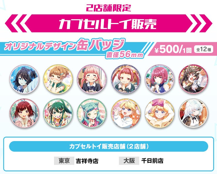 吉祥寺店(東京)、千日前店(大阪)の2店舗限定でオリジナルカプセルトイが登場!「第3回 Tokyo 7th タイプ別 アイドル大投票!!」の各タイプで1位・2位を獲得したアイドルとお出かけするシチュエーションのカードイラストを使用したオリジナルデザイン缶バッジです。