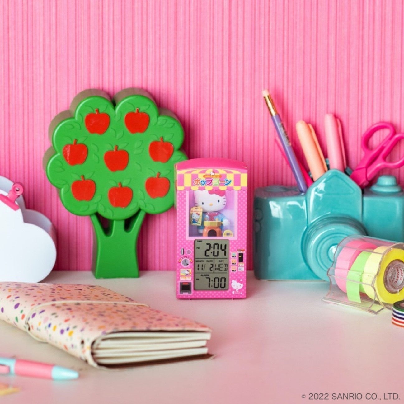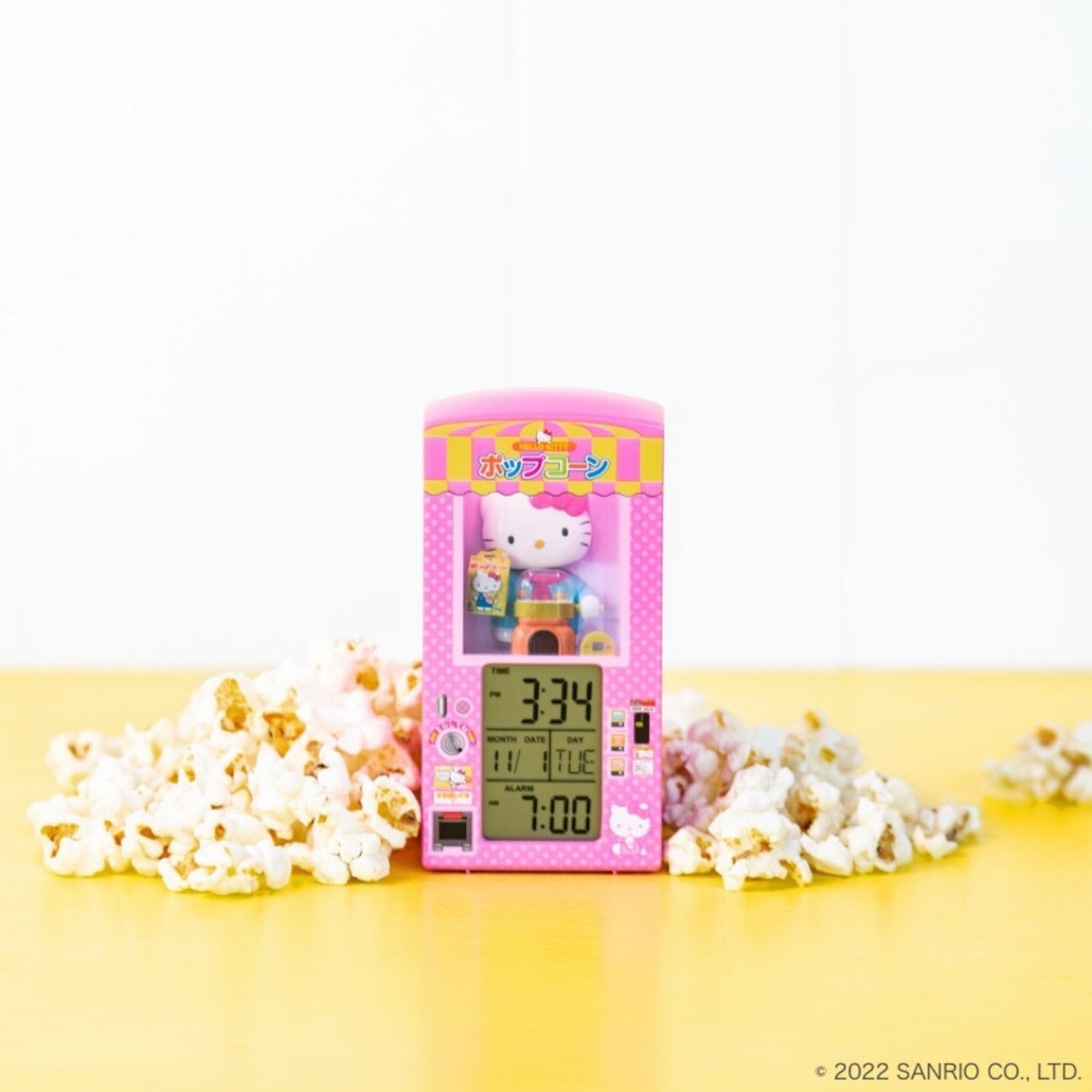 ボタンやお金の投入口などの細かい部分までプリントで再現。アラーム音は、あのおなじみの音楽と「できたてのポップコーンはいかが?」というハローキティのかわいいボイスが流れます。ちょうどいいサイズ感で、ベッドサイドで朝の目覚まし時計に、勉強や作業の時間管理に、置いておくだけでもかわいいインテリアのアクセントとして、暮らしのさまざまなシーンで活躍します。毎朝、一日の始まりがもっと楽しくなる目覚まし時計です。