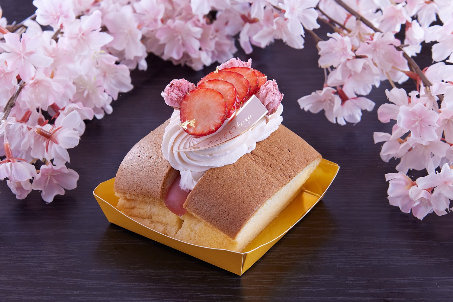 ふわしゅわ食感としっとりとした口当たりの生地に、桜餡、自家製カスタードクリームと生クリームを挟み込み、桜の花といちごをトッピングしました。