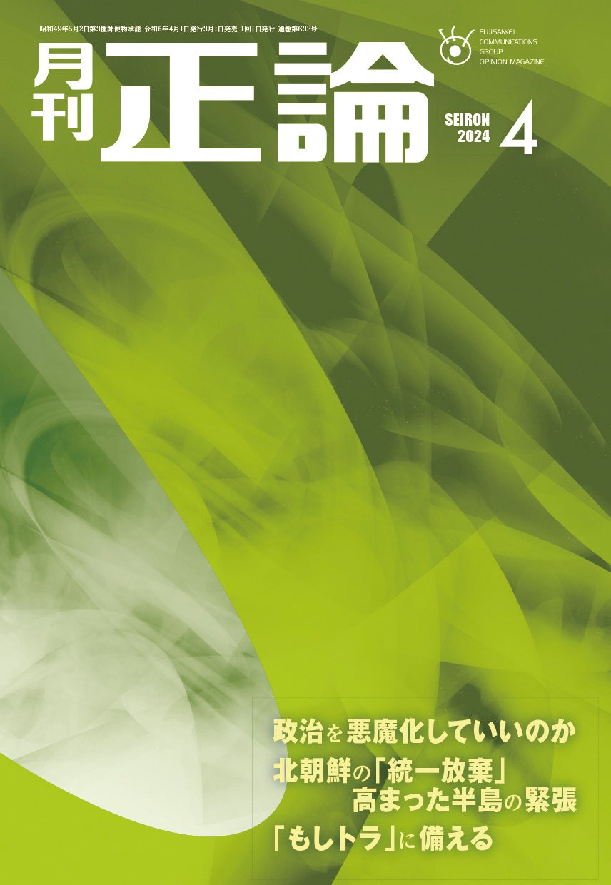 産経新聞社は、日本の針路を考える論壇誌、月刊「正論」の2024年4月号を3月1日(金)に発売しました。特集は「政治を悪魔化していいのか」「言葉を考える」「『もしトラ』に備える」の3本です。巻頭は、ジャーナリストの城内康伸氏と産経新聞客員編集委員の久保田るり子氏の対談「北朝鮮の『統一放棄』高まった半島の緊張」。朝鮮半島ウオッチャー2人が北朝鮮の内情を語っています。このほか第39回正論大賞受賞者の江崎道朗氏、第24回正論新風賞受賞者の阿古智子氏の受賞記念論文も掲載しています。