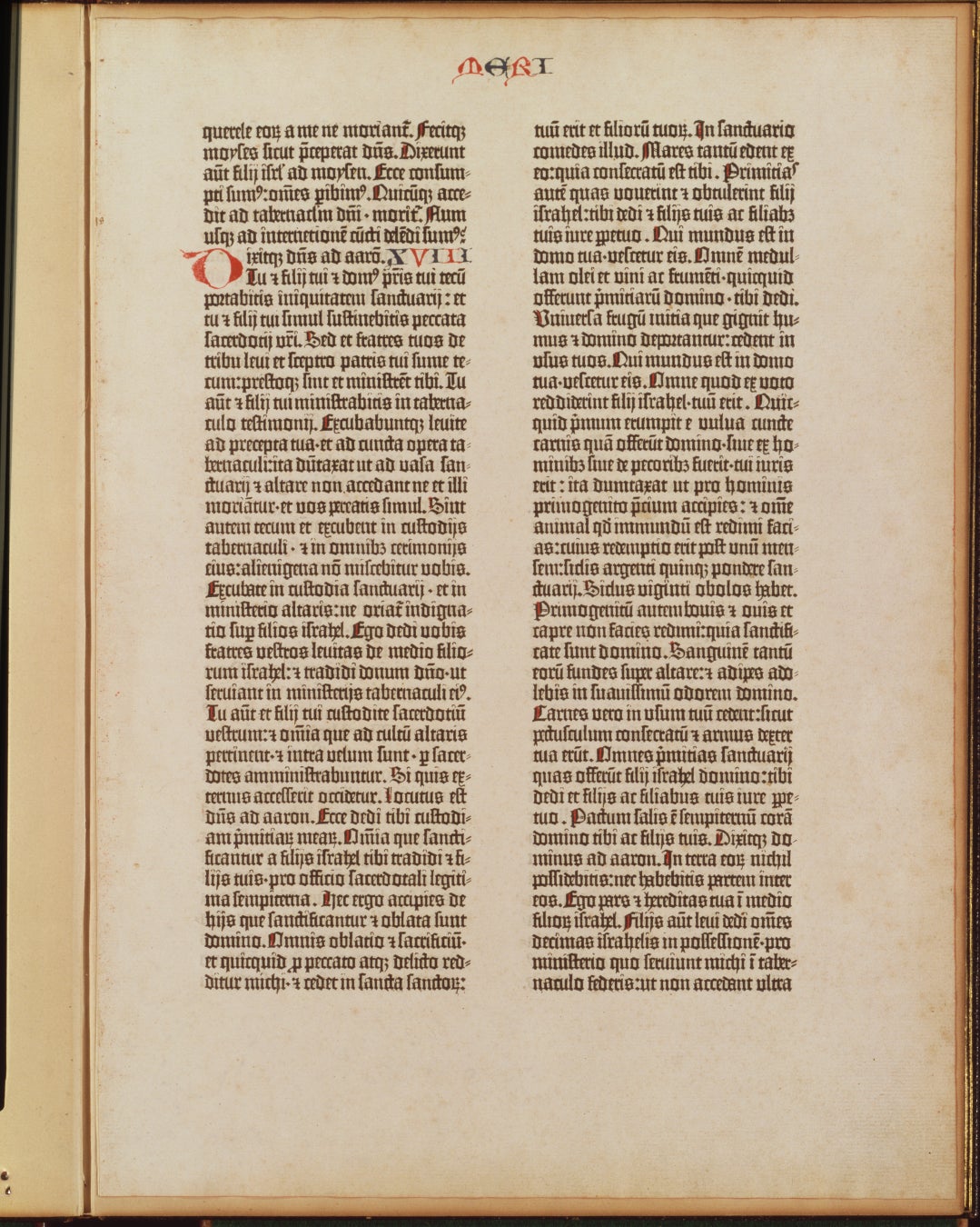 42行聖書(旧約聖書零葉) グーテンベルク印行、1455年頃 印刷博物館蔵