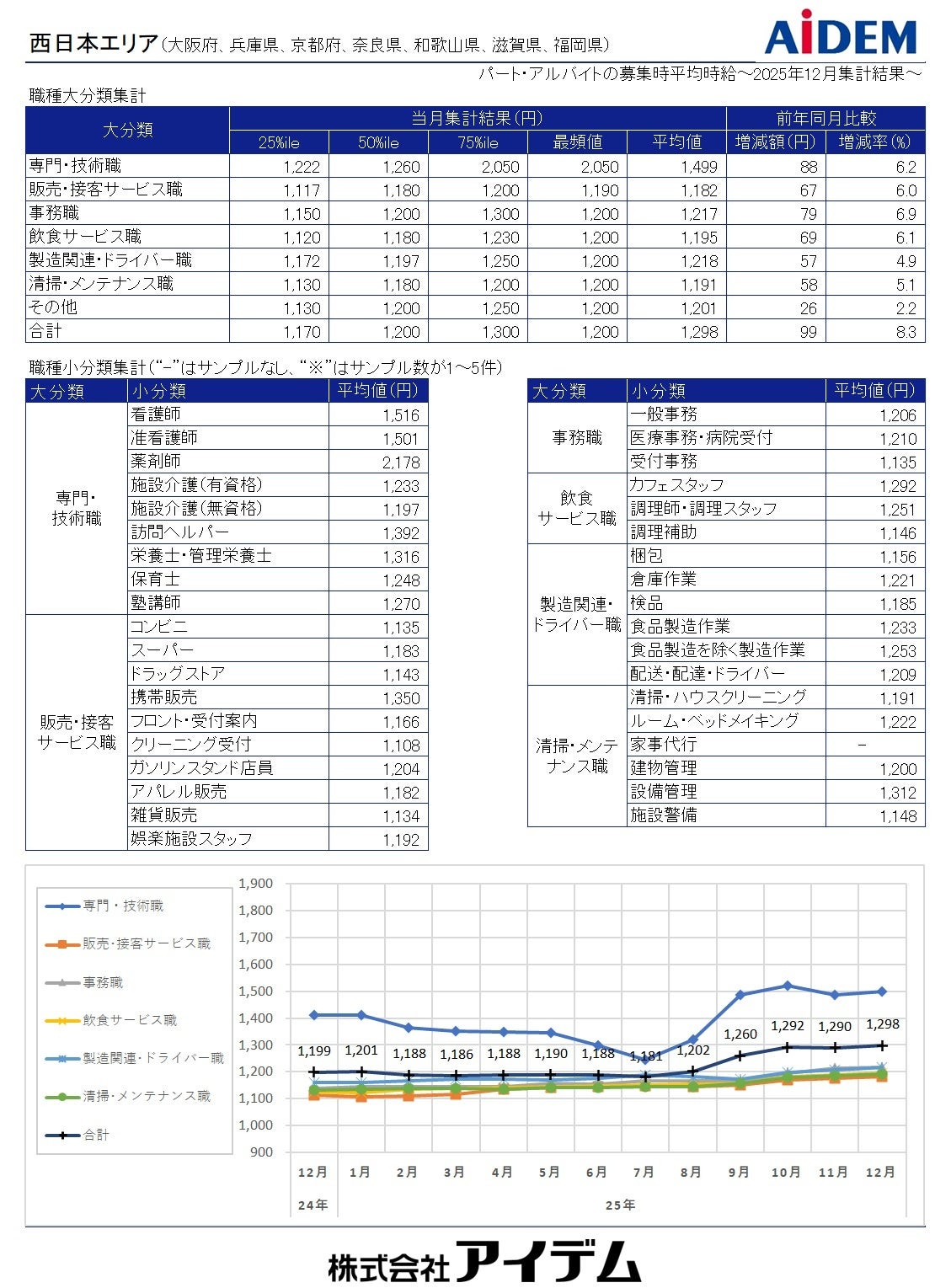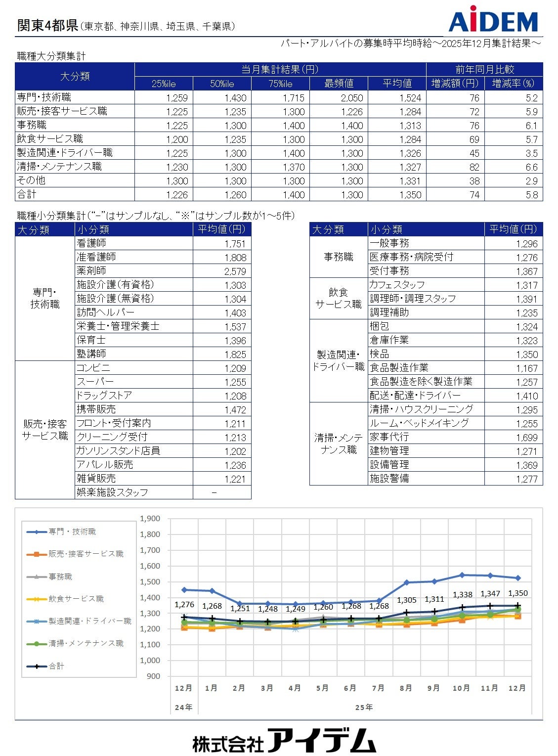 総合人材情報サービスの株式会社アイデム(本社:東京都新宿区 代表取締役社長:椛山 亮)は、求人メディア『イーアイデム』や採用ホームページ構築サービス『Jobギア採促』を利用して公表された求人情報から、2025年12月のパート・アルバイト募集時平均時給を集計いたしました。