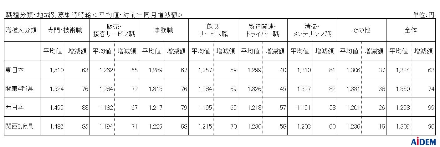 職種大分類別の平均時給は、「専門・技術職」1,485円(前年同月比85円増)、「製造関連・ドライバー職」1,230円(同58円増)、「事務職」1,229円(同68円増)、「飲食サービス職」1,215円(同70円増)、「清掃・メンテナンス職」1,203円(同60円増)、「販売・接客サービス職」1,194円(同71円増)の順で、前年同月比で全ての職種がプラスとなった。府県別の平均時給は、大阪府1,343円(前年同月比93円増)、兵庫県1,267円(同96円増)、京都府1,259円(同87円増)の順となり、前年同月比で全ての府県がプラスとなった。
