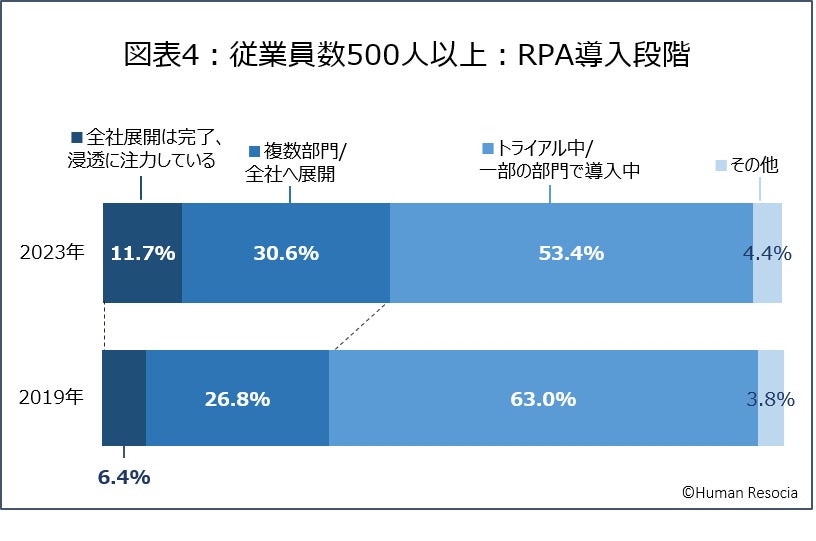 また、導入段階を企業規模別にみると、従業員数500名以上の企業が先行して複数部門から全社展開に進めており、2023年においては、中堅規模の企業でも社内でのRPA利用が拡大してきていることがわかります(図表2、3、4)。このことにより、低コストで、業務プロセスを変更することなく、現場主導で自動化が図れることから、中小企業でもRPA活用が拡大していると考えられます。