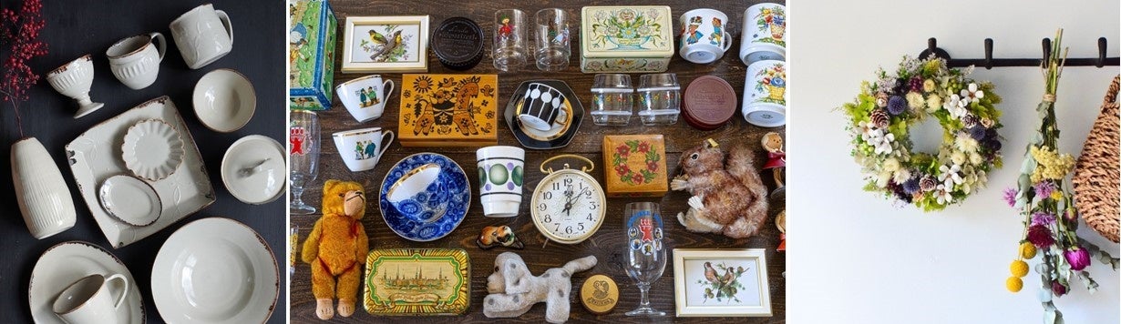 古き良き時代の食器、インテリア雑貨、古着、アクセサリーなどを扱う50以上のお店が出店します。ランチやスイーツが楽しめる飲食ブースも。