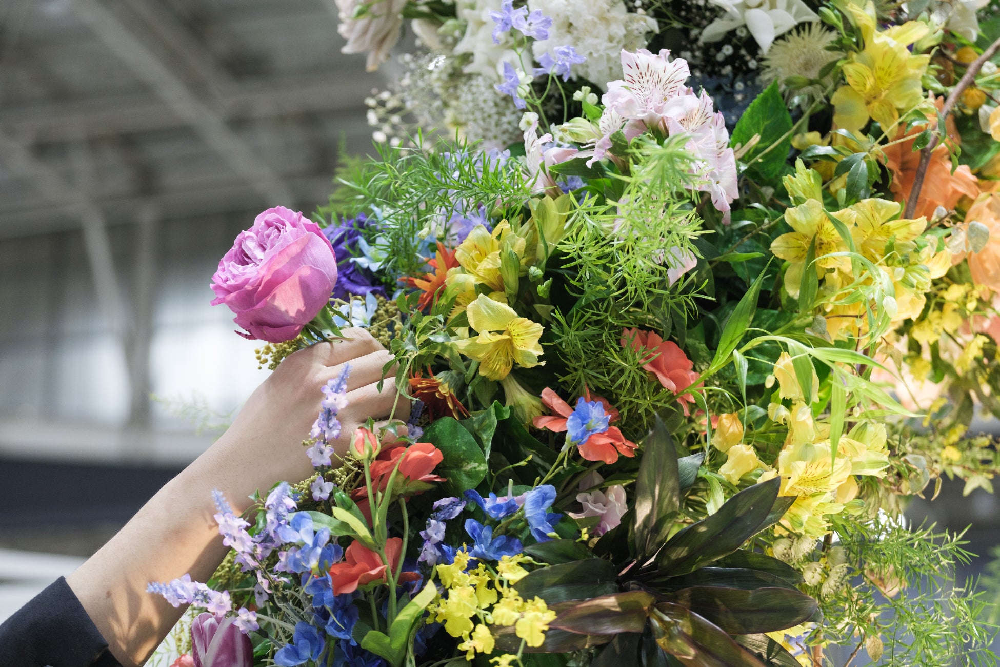 その第一弾として、5月3日(土)から開催された「横浜フラワー&ガーデンフェスティバル2025」にて、市内で5か所の結婚式場を展開する(株)テイクアンドギヴ・ニーズ様からご提供いただいた結婚式の装花をアップサイクルし、来場者参加型でオブジェを制作するイベントを実施しました。