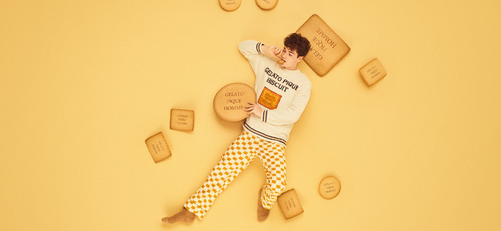 食欲の秋をテーマに、こんがり焼いた香ばしいビスケットをモチーフにしたニットと総柄パンツ