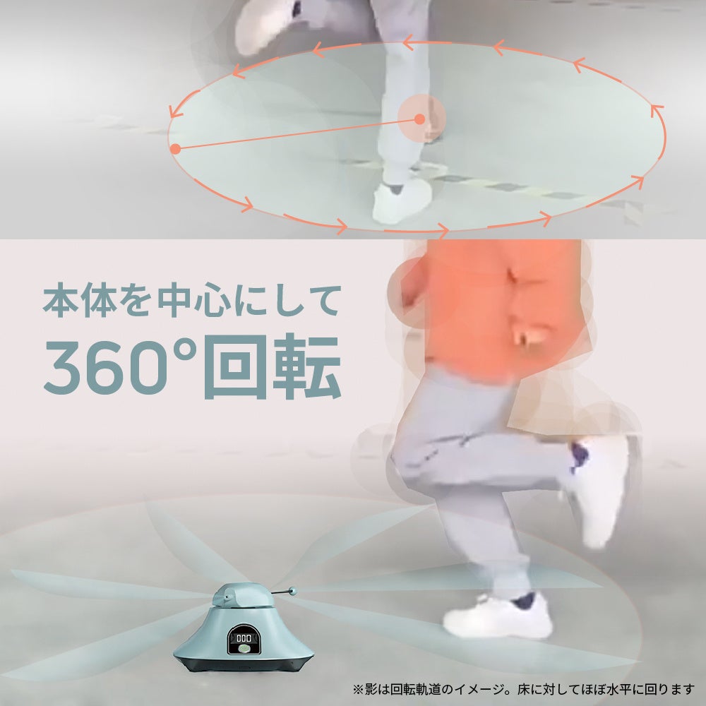 スイッチを入れたら、本体を中心にしてロープが360°ぐるっと回り始め、床からほぼ水平に回転することができます。