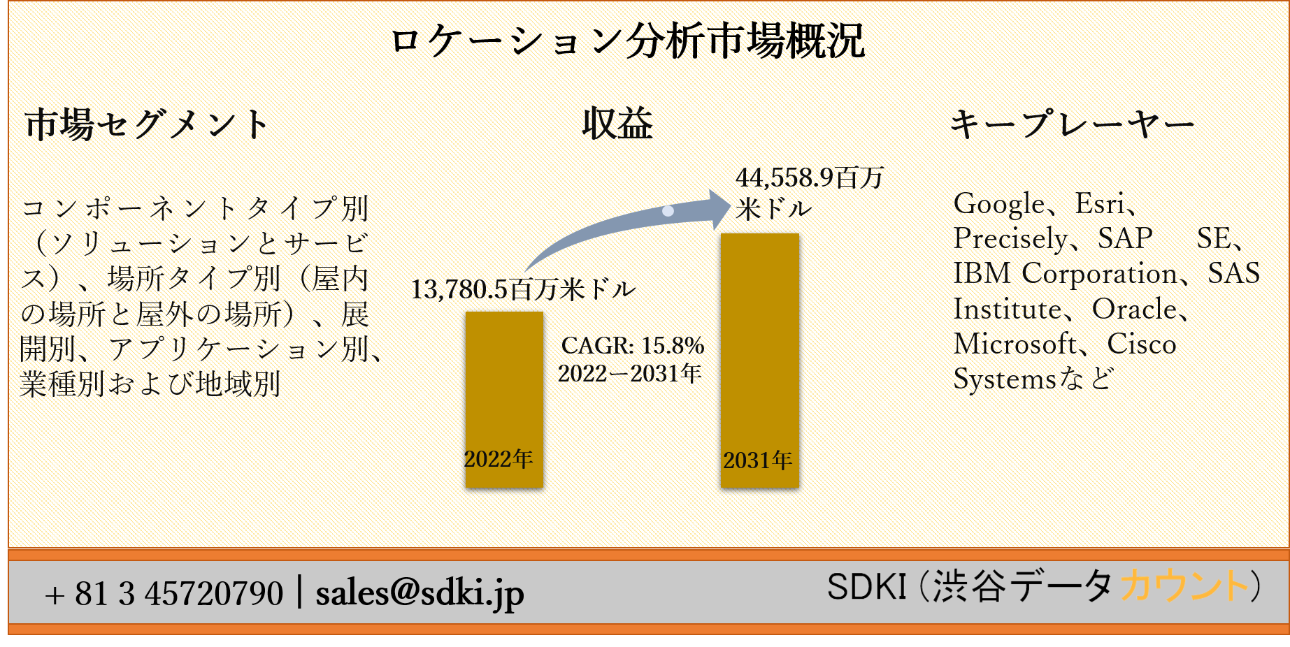 SDKI Inc.は、「ロケーション分析市場ー予測2022ー2031年」新レポートを 2022年01月05日に発刊しました。この調査には、ロケーション分析市場の成長に必要な統計的および分析的アプローチが含まれています。レポートで提供される主要な産業の洞察は、市場の既存のシナリオに関する読者に市場の概要についてのより良いアイデアを提供します。さらに、レポートには、市場の成長に関連する現在および将来の市場動向に関する詳細な議論が含まれています。