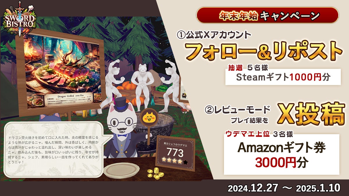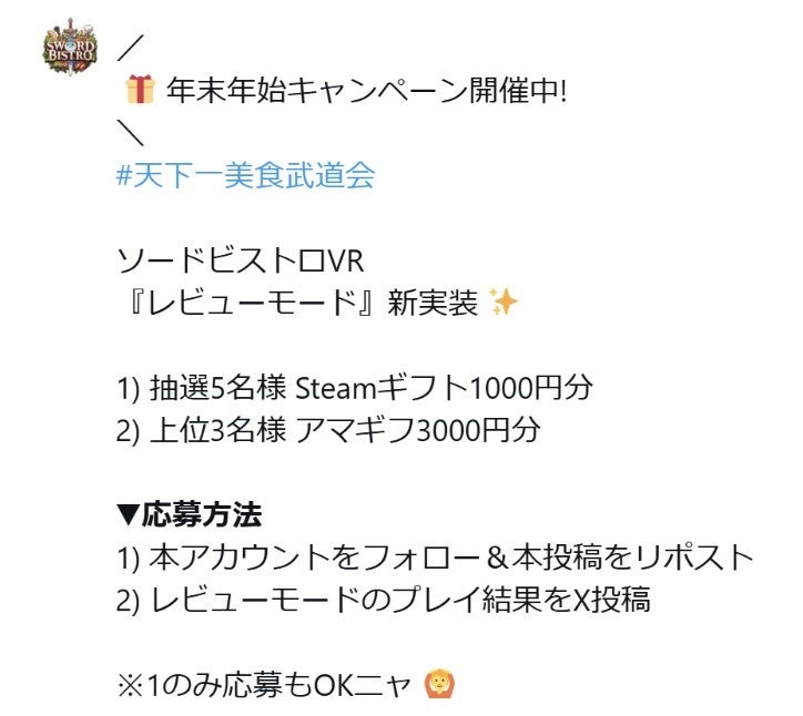 さらに、まだソード・ビストロVRをお持ちでない方も、公式Xアカウントをフォロー&リポストすることで、抽選で5名様にSteamギフトカード1000円分をプレゼントいたします。
