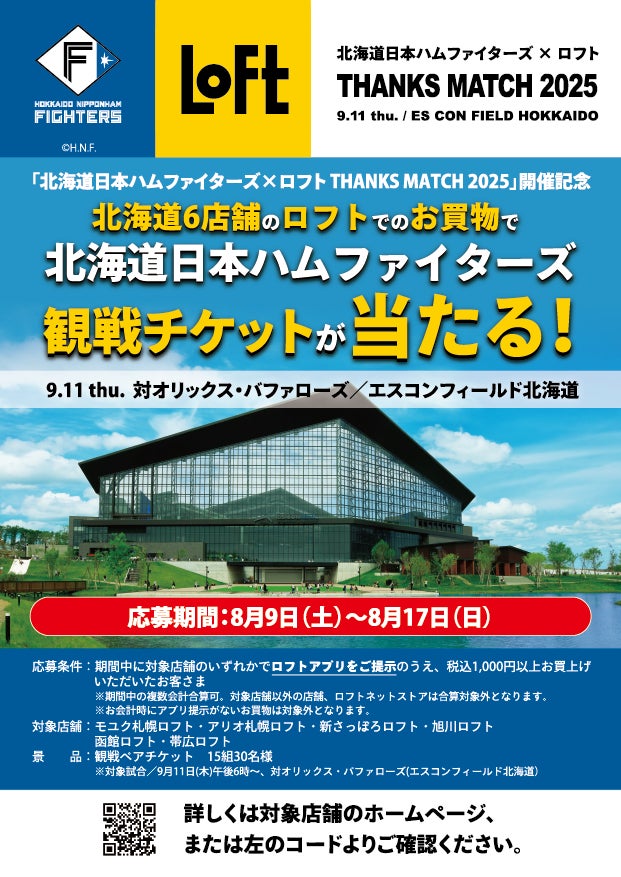 株式会社ロフト(東京都渋谷区/代表取締役社長 安藤公基)は、2025 年9月11日(木)に「北海道日本ハムファイターズ×ロフトTHANKS MATCH 2025」をエスコンフィールドHOKKAIDO(北海道北広島市)にて開催します。ロフトは、北海道日本ハムファイターズとの「THANKS MATCH 2025」開催を記念し、日頃の感謝の気持ちを込めて、北海道内の6店舗限定(モユク札幌ロフト・アリオ札幌ロフト・新さっぽろロフト・旭川ロフト・函館ロフト・帯広ロフト)で、9月11日(木)の「北海道日本ハムファイターズ×ロフトTHANKS MATCH 2025」の観戦チケットが当たるお買上げキャンペーンを8月9日(土)より実施いたします。