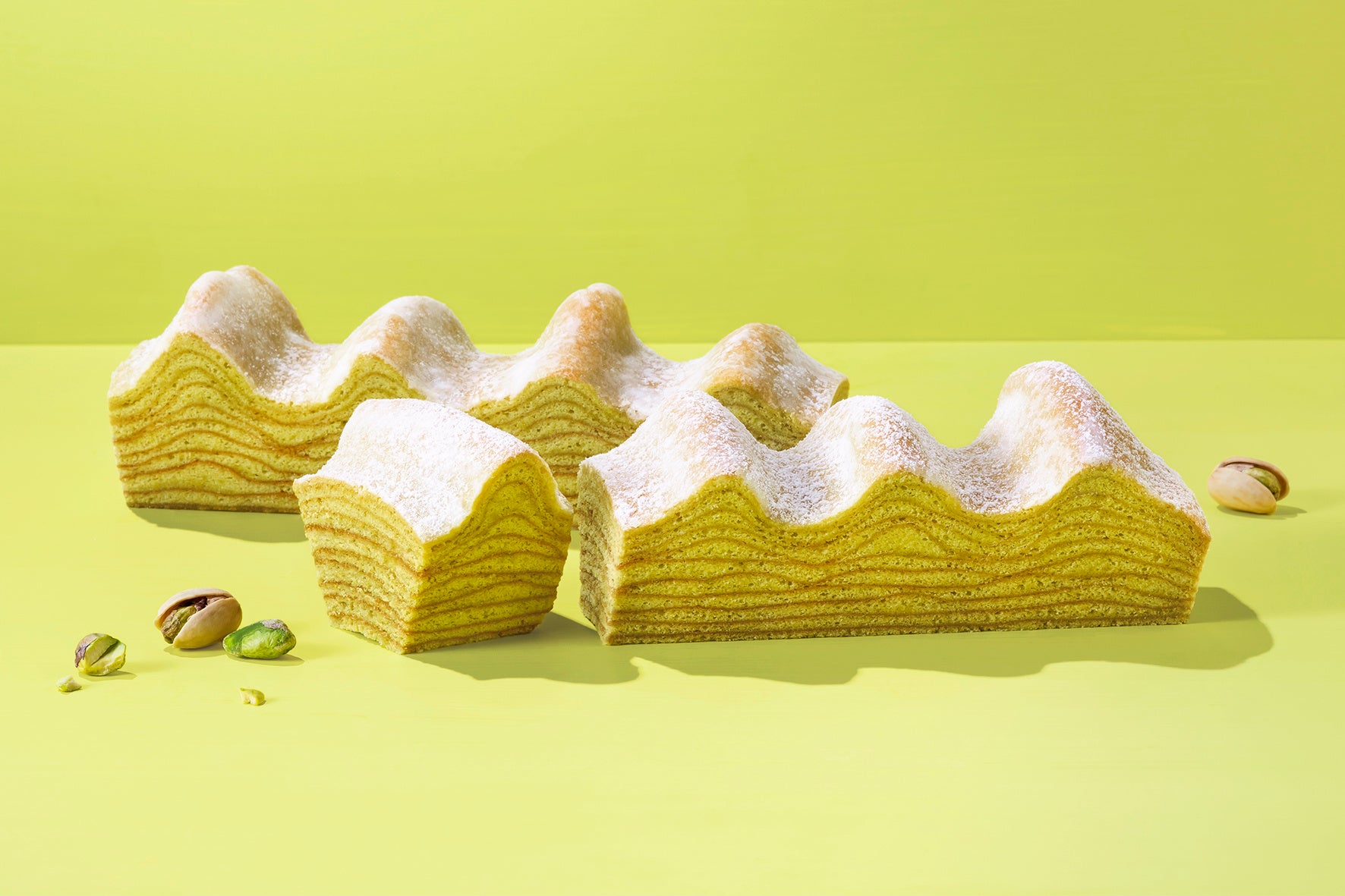 ナッツの女王「ピスタチオ」を惜しみなく使用しました。高品質として知られる“カリフォルニア産ピスタチオ”をじっくりと焙煎し、旨味たっぷりのペースト状に。濃厚なバター風味の生地にとろりと練り込んで、一層一層丁寧に焼き上げました。外はカリッと、中はしっとり熟成。ピスタチオとバターが出会うことで生まれる芳醇なコクとふくよかな甘みは、まさに贅沢。ひとくち頬張るとたちまち広がる、香ばしいピスタチオフレーバーも存分にお楽しみください。