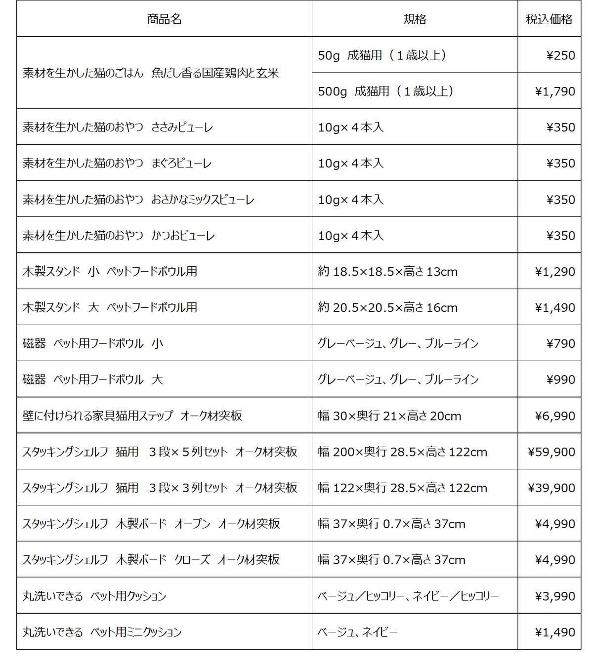 このたび、ペットを家族の一員として共に生活する方が増えている社会的背景から、人もペットも両者が共に快適に暮らすためのもののあり方を考え、ペットの中でも室内飼育が推奨されている猫が、ストレスなく生活できる商品を開発しました。人が使って気持ちいいもの、安心できるものを、家族の一員である猫にも共有してほしいという思いから、素材を生かしたごはんやおやつ、無印良品の定番家具と同じシリーズの猫用家具を発売いたします。
