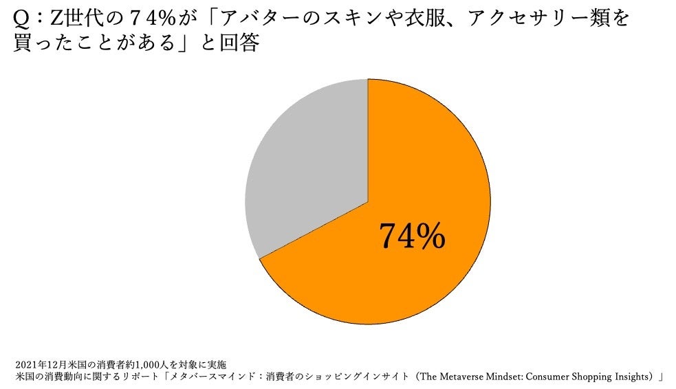 米国の消費動向に関するリポート「メタバースマインド:消費者のショッピングインサイト(The Metaverse Mindset: Consumer Shopping Insights)」が21年12月に米国の消費者約1,000人を対象にした調査では、バーチャルストアを訪れたことがある人の70%が“買い物をした”と回答をしており、Z世代の52%が“アバター用のアイテムに49.99ドル(約5,700円)までなら支払う”と回答しています。バーチャルストアで買い物をしたことのある人で“再び買い物をすると思う”と回答した割合はZ世代が54%、X世代が67%で、Z世代の54%は“オンライン上のどこでも買い物ができるようにしてほしい”と回答しているほか、Z世代の51%、ミレニアル世代の44%が、好きなブランドがゲーム内で提供するバーチャル体験に“非常に興味がある”と答えています。