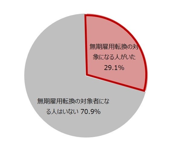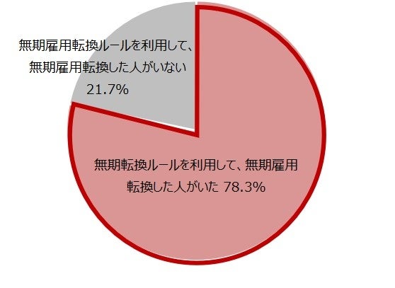 無期転換ルール※の施行(2013年4月1日)以降、無期雇用転換が可能な対象者が在籍する企業は29.1%、そのうちルールを利用した人がいる企業は78.3%となった。【図4-1】【図4-2】