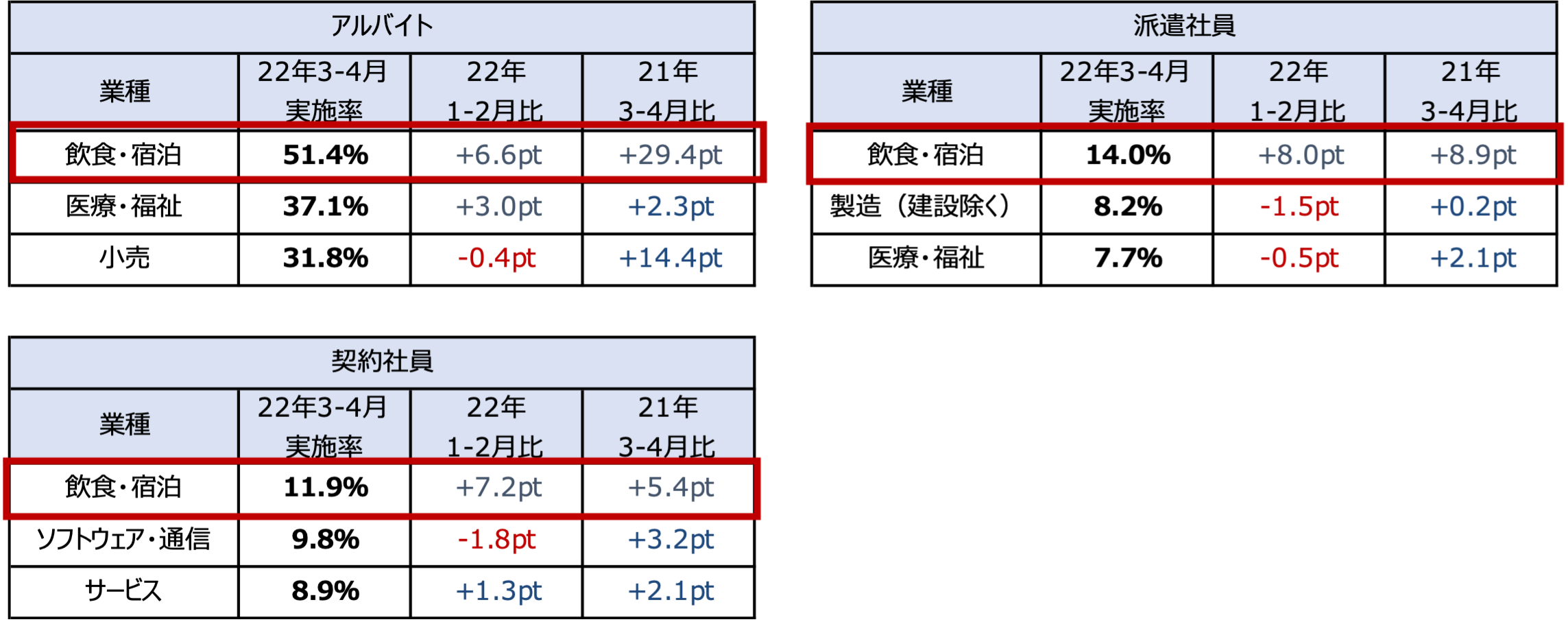 採用活動実施率も[飲食・宿泊]が最も高く、アルバイトが51.4%(21年3-4月比:29.4pt増)、派遣社員が14.0%(21年3-4月比:8.9pt増)、契約社員が11.9%(21年3-4月比:5.4pt増)となった。【図3】