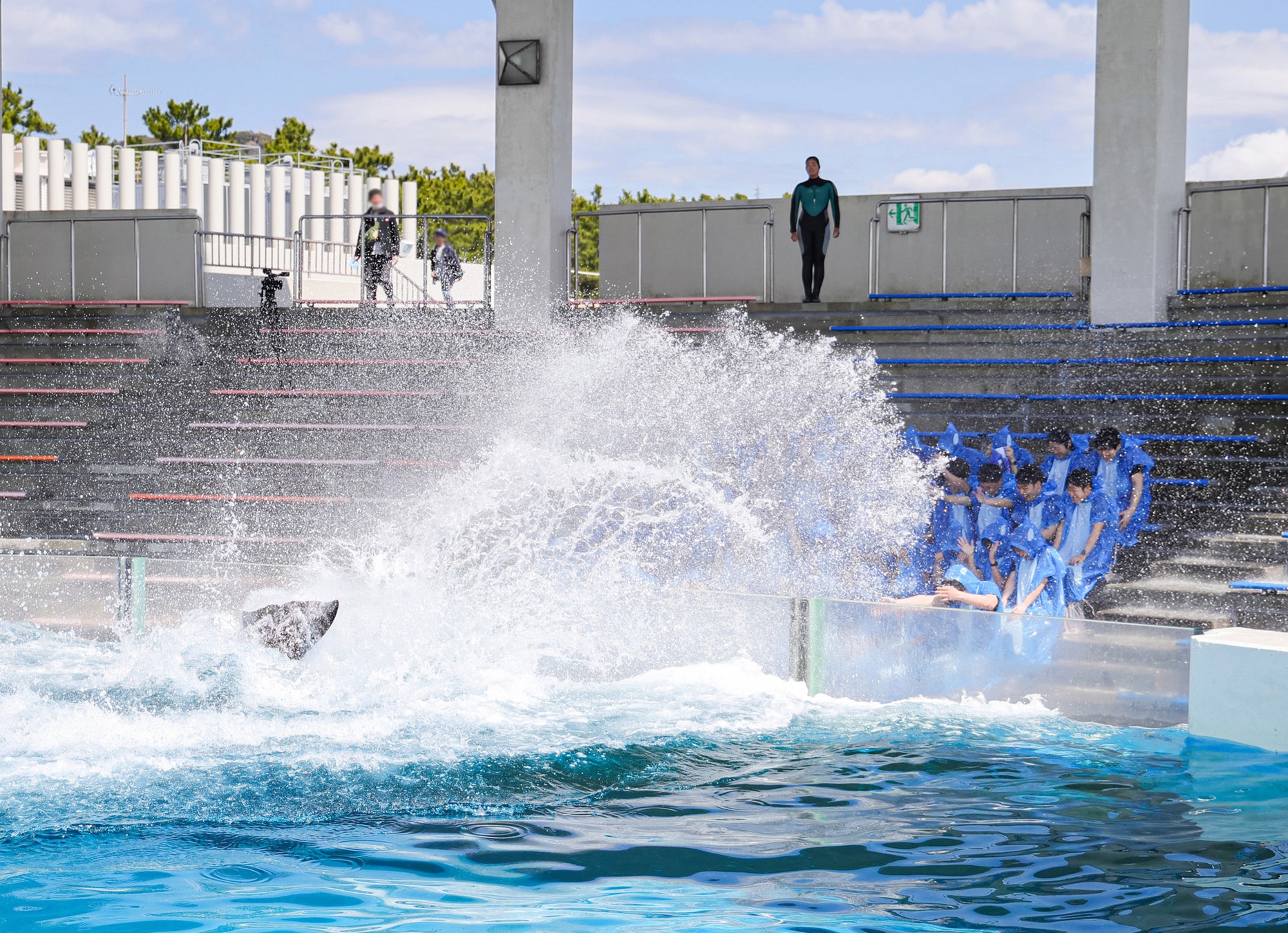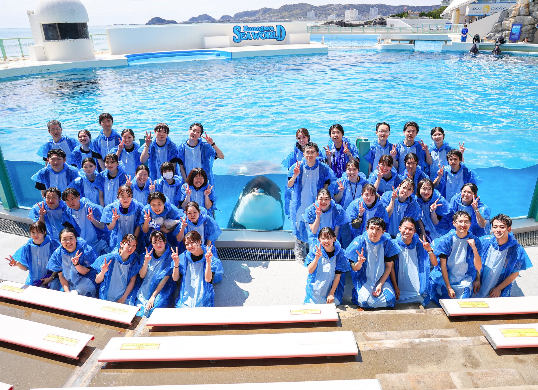 鴨川シーワールドは1970年10月1日に開業し、日本で初めてシャチの飼育と繁殖に成功した水族館です。55周年を迎える2025年度は新たに41名が入社しました。歓迎の意味を込めて実施された入社式では、大先輩ともいえるシャチ「ララ」(24歳、体長5.5m、体重2.4t)から祝福の「テールバースト」が実施され、大人の身の丈に迫るシャチの巨大な尾ビレから放たれた水しぶきは、新入社員たちのこわばっていた表情を緩め、歓声と笑顔を引きだしてくれました。