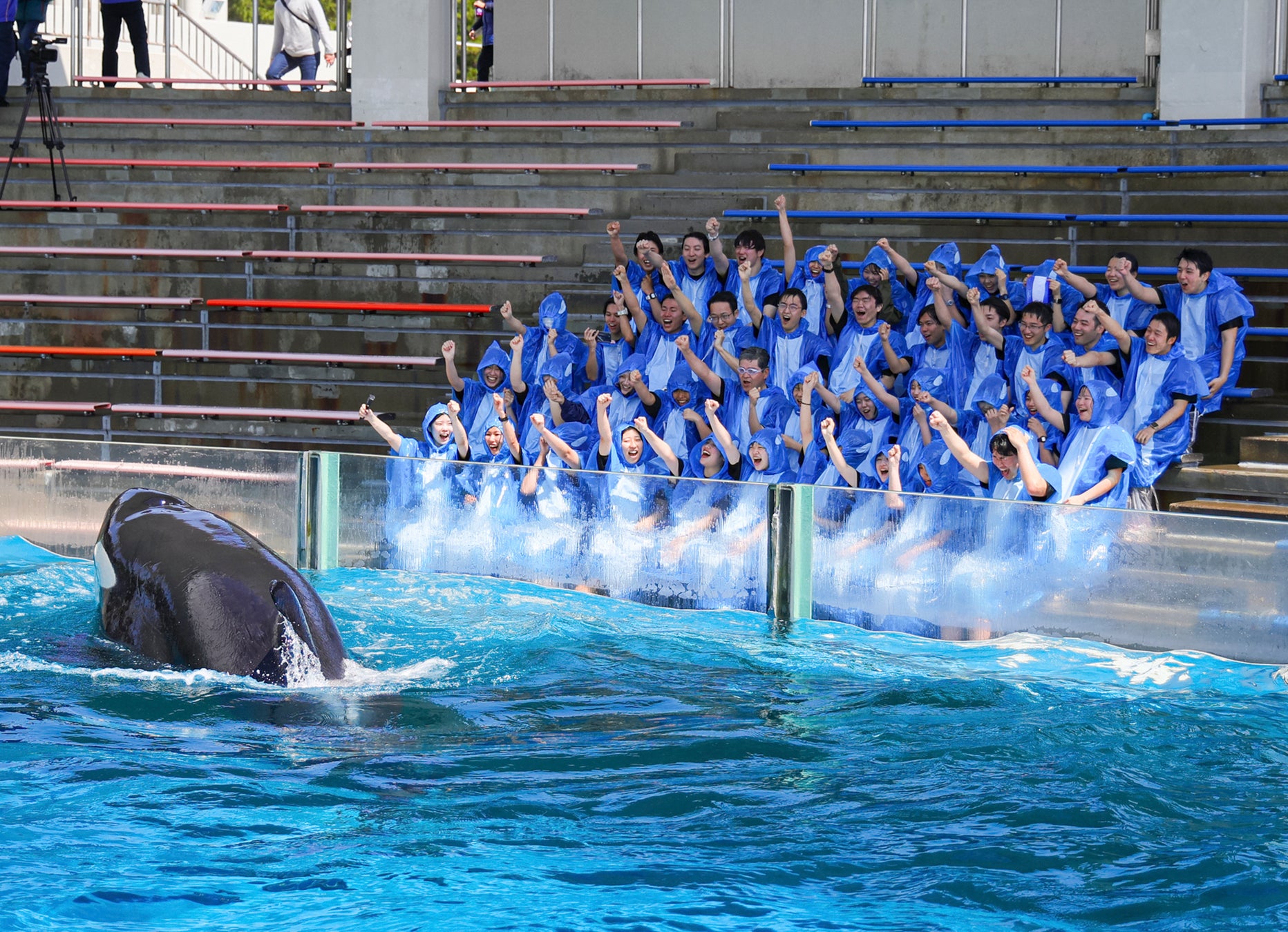 日本屈指の激しさを誇る当館の入社式は、この春で8回目を迎えます。シャチのパワーを目の当りにした新入社員たちが社会の荒波にくじけることなく成長していく姿を皆さんで見守ってください。