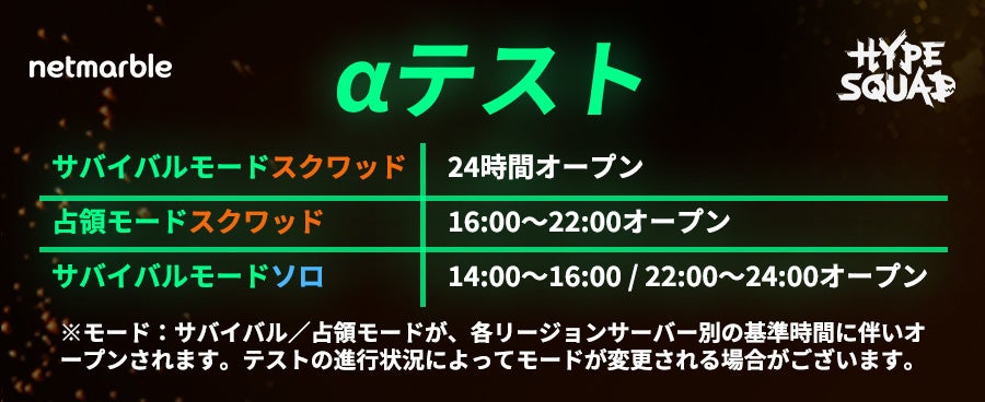 αテスト期間中は、「サバイバルモード」と「占領モード」の2つのゲームモードを遊ぶことができます。サバイバルモードでは、3人スクワッドとソロマッチングのいずれかを選択できます。サバイバルモードの3人スクワッドは24時間いつでも遊べますが、占領モードの3人スクワッドとサバイバルモードのソロマッチは特定の時間帯でしか遊べません。