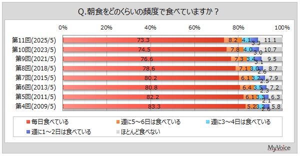 マイボイスコム株式会社(東京都千代田区、代表取締役社長:高井和久)は、11回目となる『朝食』に関するインターネット調査を2025年5月1日~7日に実施しました。