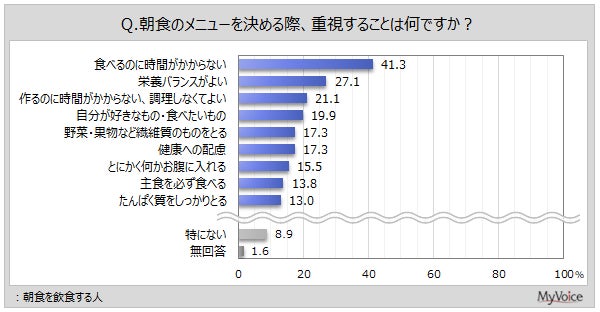朝食を飲食する人が、メニュー決定時に重視することは(複数回答)、「食べるのに時間がかからない」が41.3%、「栄養バランスがよい」「作るのに時間がかからない、調理しなくてよい」が各20%台です。