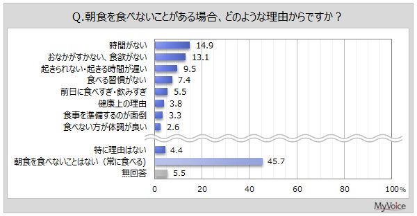 https://myel.myvoice.jp/products/detail/32203 ※上記設問の他に、「朝食にかける時間」「平日の朝食パターン」なども聞いています。 |