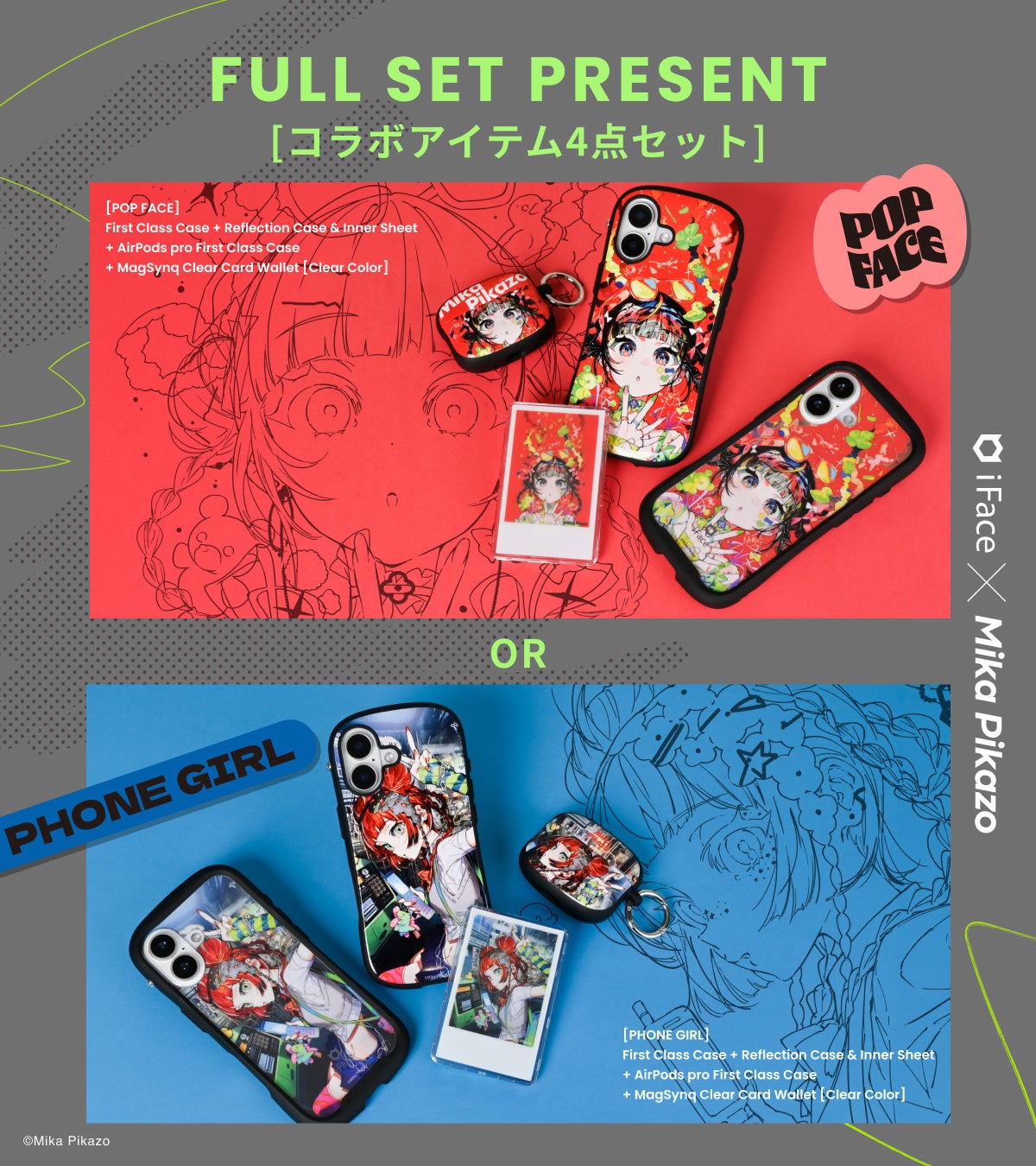 内容:iFace公式Xのフォロー&キャンペーン投稿をリポストしていただいた方の中から抽選で2名 様にMika Pikazoコラボ製品4点セットをプレゼント。
