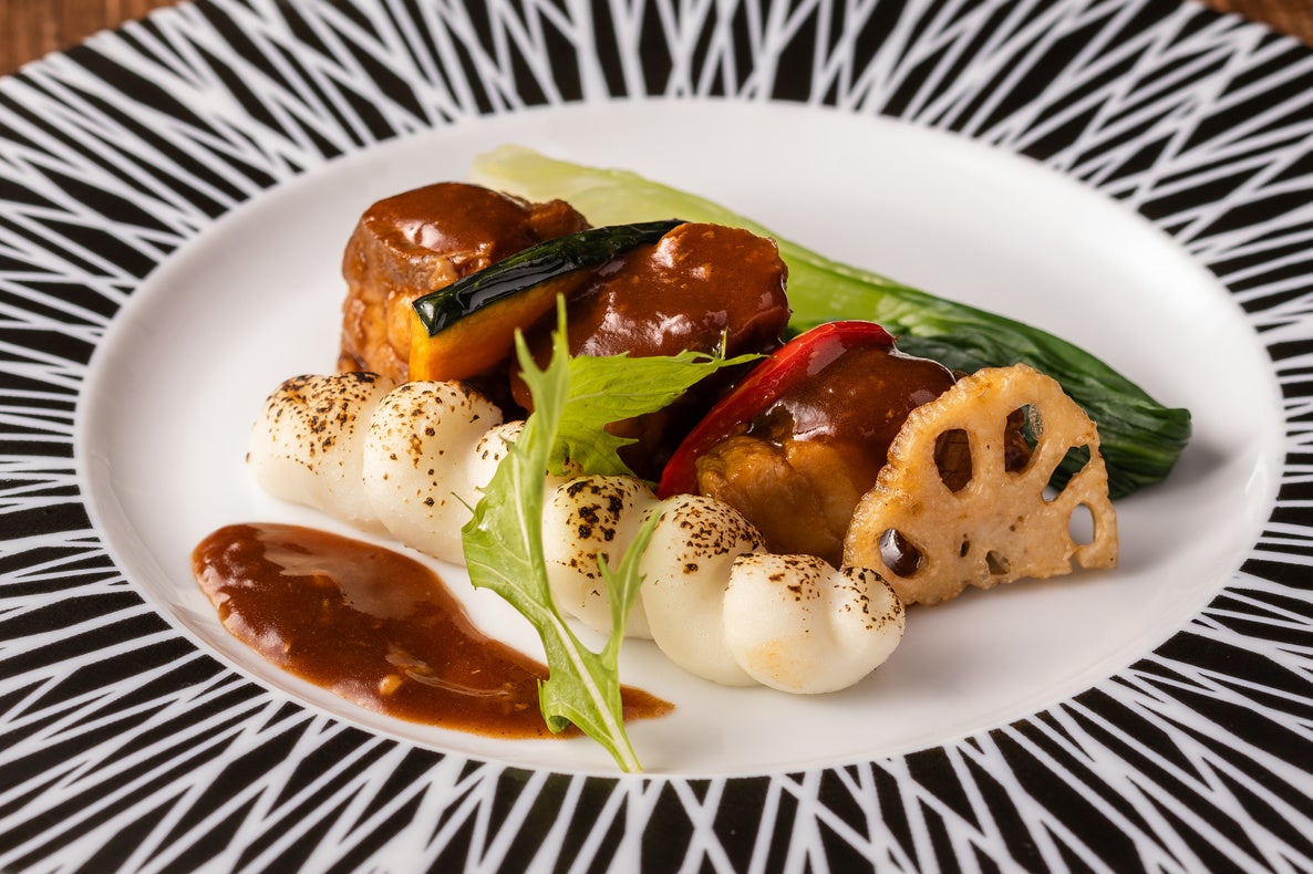 メインディッシュは広島県産府中味噌のビーフシチューなど4種からチョイス