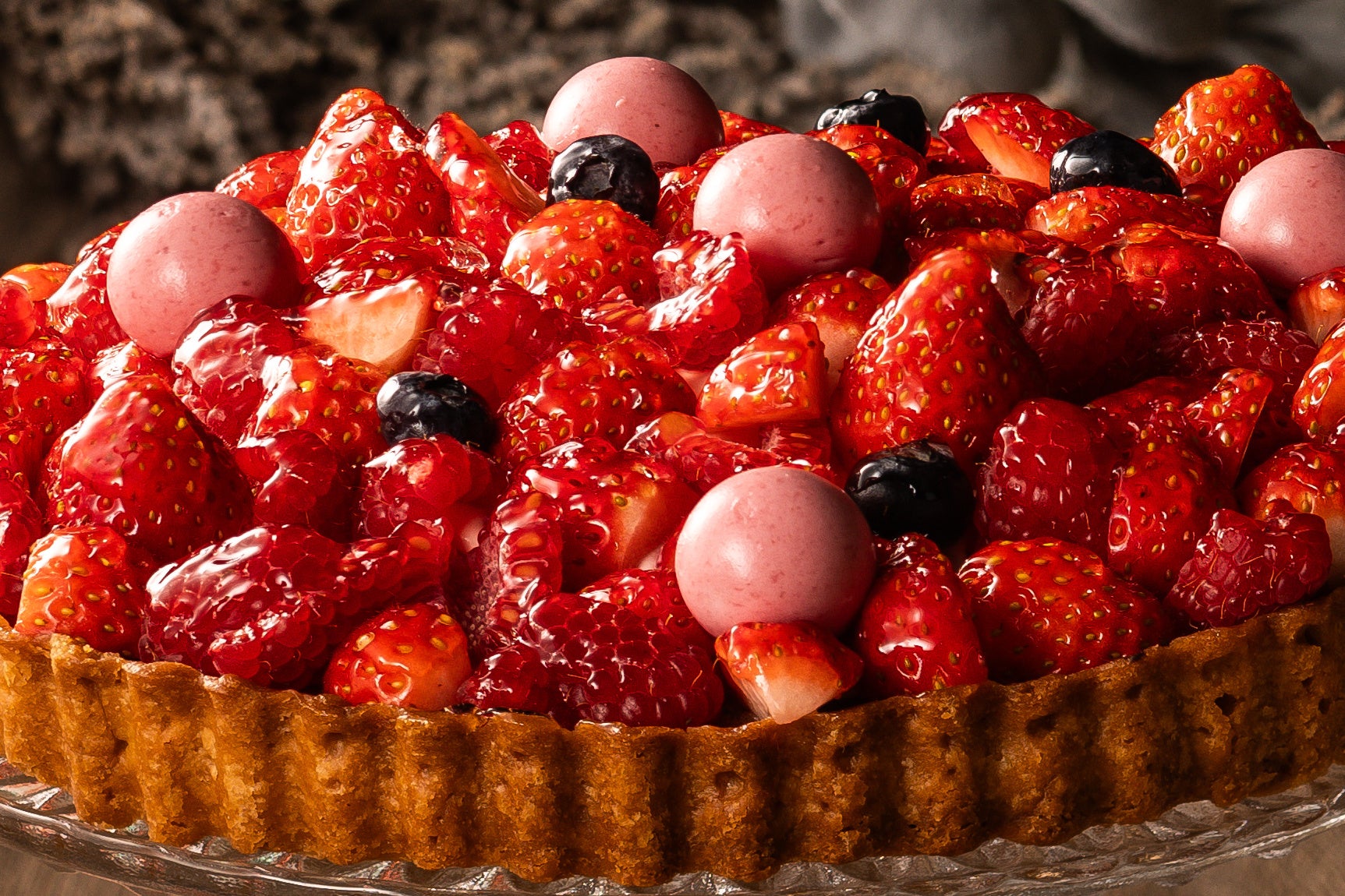 バターの香りが豊かで、サクサクとした食感のタルト生地にアーモンドの香ばしさを添えました。旬のベリーをたっぷりと盛り付け、フレッシュな酸味と自然な甘みのタルトです。