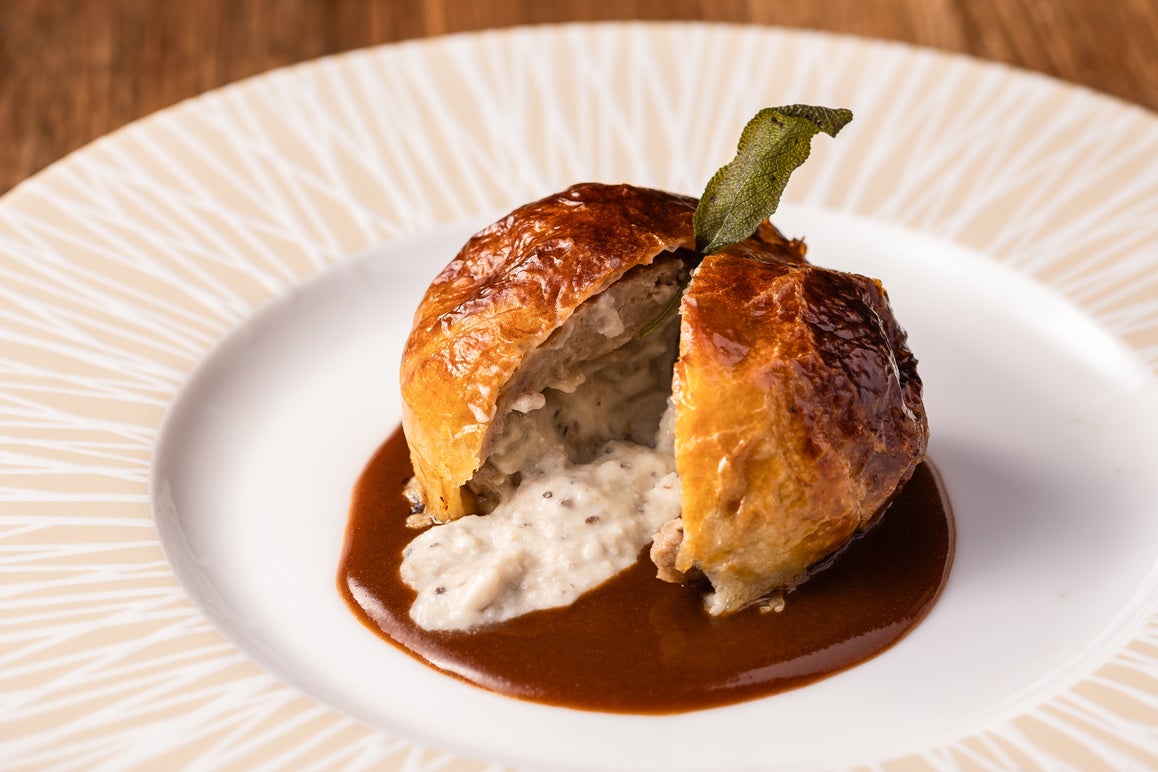 自家製ハンバーグの中に茸のデュクセルソースを包み込み、パイ生地で包んで焼き上げました。茸の旨味とハンバーグの食感、パイ生地の食感のバランスが特徴の一品です。