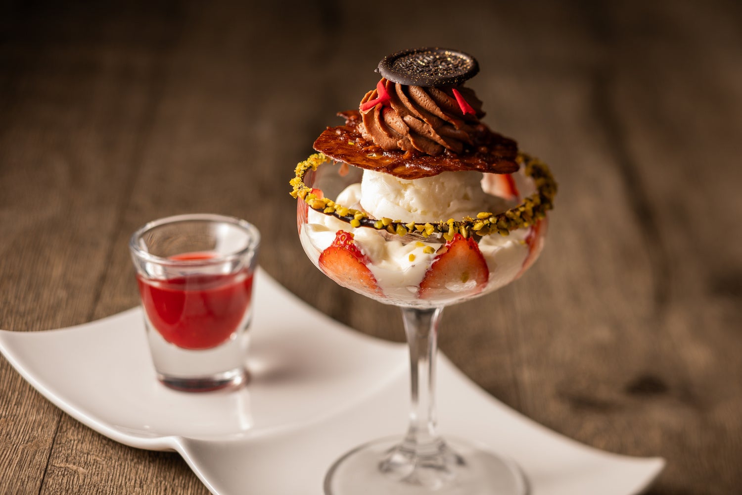 いろんな食感と味が楽しめる、チョコレートベースのスイーツです。なめらかなブランマンジェ、濃厚なチョコレートムース、サクサクのクッキー、クリーミーなバニラアイスが、心地よく重なり合っています。軽いココアのチュイールとリッチなチョコレートクリームをトッピングして、食材の味や食感の変化を楽しめるようにしました。温かいベリーソースを添えることで、味と温度に少し遊び心をプラス。いろんな味と食感を一緒に楽しめるデザートです。