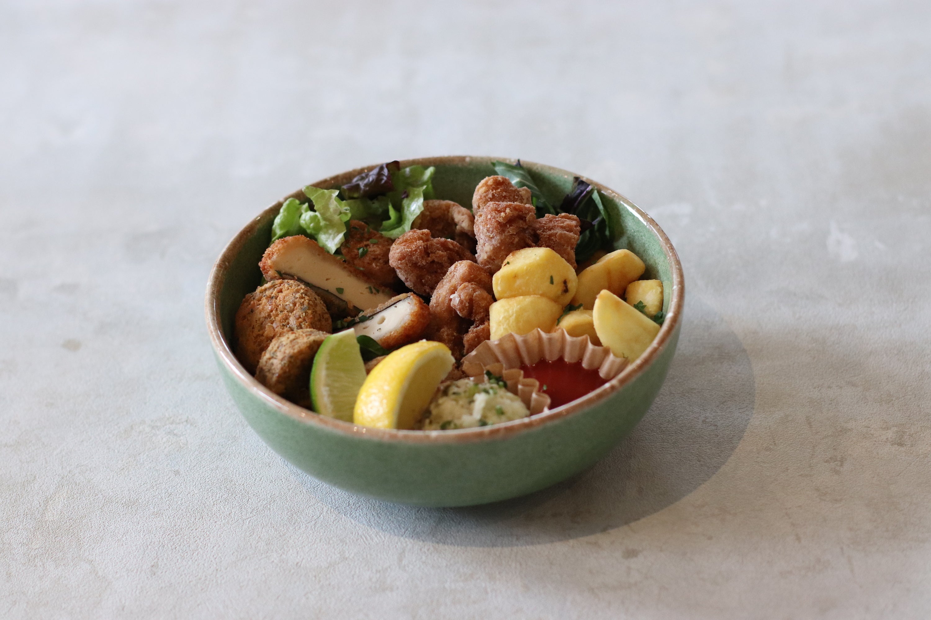 大人気のヴィーガンフライ3種(ベジからあげ・ひよこ豆のファラフェル・お魚風フライ)を合わせた、スナックやおつまみにもなる盛り合わせ。お子様から大人までお楽しみいただけます。