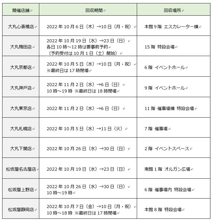 お客様自身で回収ボックスへ投入していただく従来の機能に加え、クーポンの取得もご自分でできる非接触の回収ボックスを、2022年3月から全国5店舗で試験導入いたしました。今回は対象店舗を全国9店舗(心斎橋店・梅田店・京都店・神戸店・東京店・札幌店・名古屋店・上野店・静岡店)に拡大し、より多くのお客様に安全・安心、かつ時間効率もアップする回収方法を提供いたします。