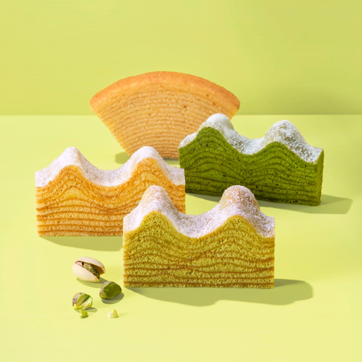 バター⾵味たっぷりの代表作『マウントバーム しっかり芽』と、新作『ピスタチオ香るマウントバーム』を⼀度に楽しめる夏限定の詰合せ。