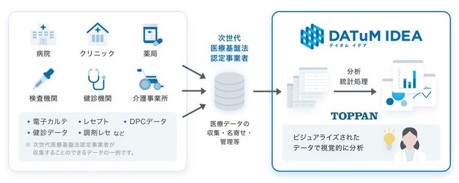 TOPPANホールディングスは「健康・ライフサイエンス」領域を今後の成長領域と定め、次世代医療基盤法(※1)に基づき、匿名加工された電子カルテデータを基にした医療情報分析・提供サービス「DATuM IDEA®」を製薬会社およびアカデミア・医療機関に提供しています。