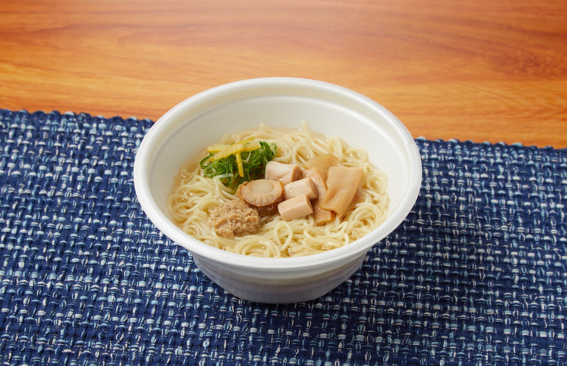 プと相性のよい細めの麺です。具材はほたてとほたて風かまぼこ、さ