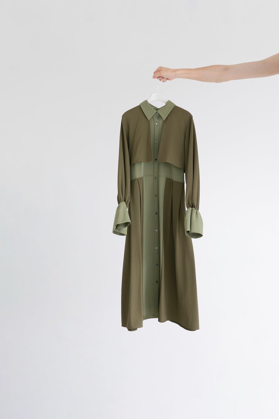 プリーツやタック、ギャザーで立体感を出し、高見えデザインするワンピース。コートのディティールを取り入れているので羽織で着ても様になる一着です。