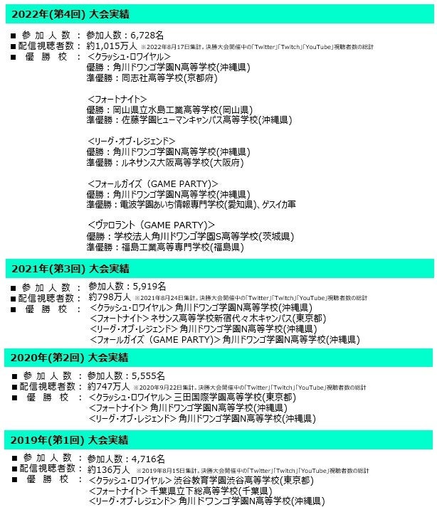 昨年の第4回大会では、過去最大のエントリー数となる全国2,060校・2,559チーム・6,728名の高校生が参加!大会のライブ配信総視聴者数は、約1,015万人を記録し、日本最大※の”高校eスポーツの祭典”となりました。