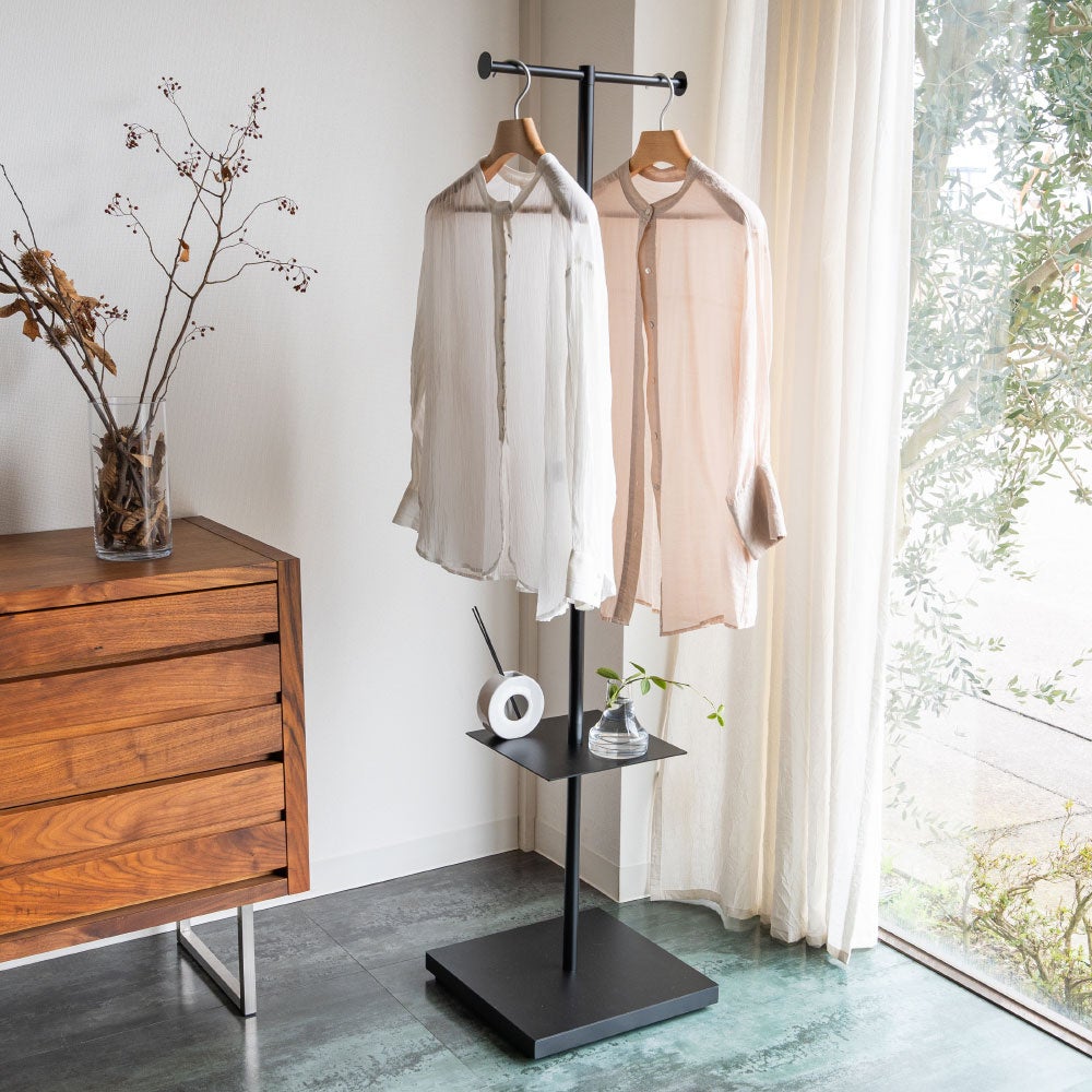「朝の支度が心地よくなる」をコンセプトにした、サイドテーブルとコートハンガーを融合したハンガーです。ポールハンガーの足元はデッドスペースになりがちですが、テーブルを付けることで、眼鏡や時計などの小物を置くことができ、翌日のコーディネートが軽やかに完成します。圧迫感なく置けるスリムなサイズ感ながら、収納力は充分。寝室や玄関、リビングや通路においても違和感なくお部屋に溶け込みます。