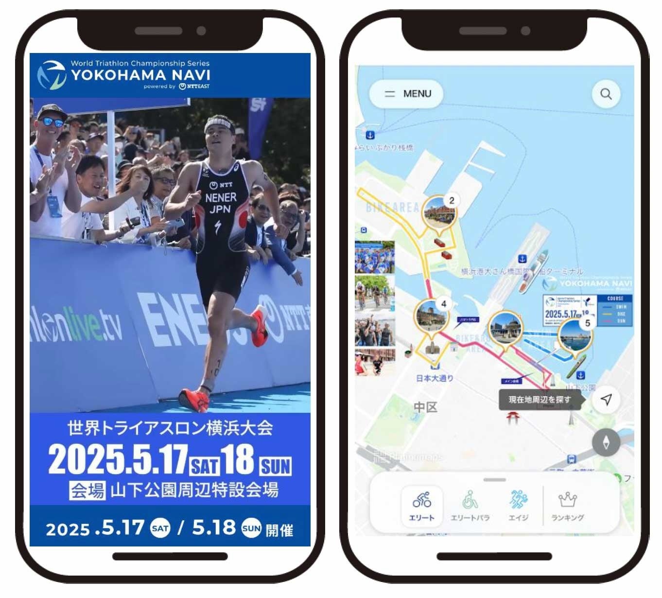 大会トップパートナーである東日本電信電話株式会社の協力により、競技や大会の魅力を幅広い層に発信し、トライアスロンのファン拡大および競技振興を目指し、来場者が大会をより楽しめるコンテンツを提供する新しいスマートフォンアプリ「WorldTriathlon Championship Series YOKOHAMA NAVI powered by NTTEAST」を提供します。