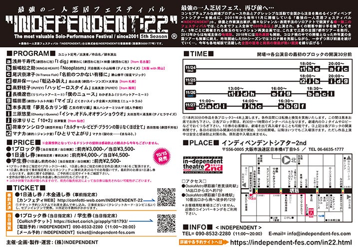 株式会社INDEPENDENT(大阪府大阪市、代表:相内唯史)主催、『最強の一人芝居フェスティバル INDEPENDENT:22』が2022年11月24日 (木) ~2022年11月27日 (日)にインディペンデントシアター2nd(大阪府大阪市浪速区日本橋4丁目9-5インディペンデントシアタ-2nd)にて上演されます。