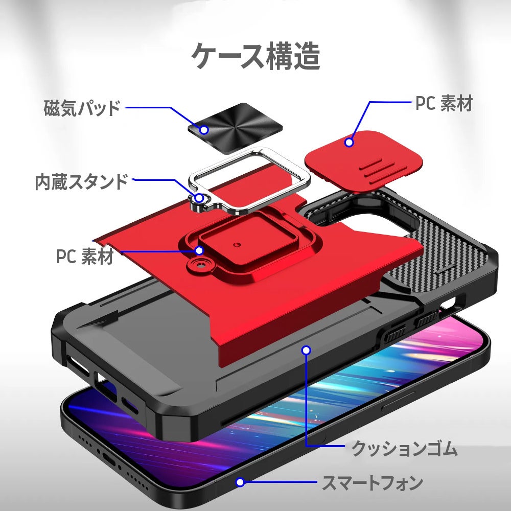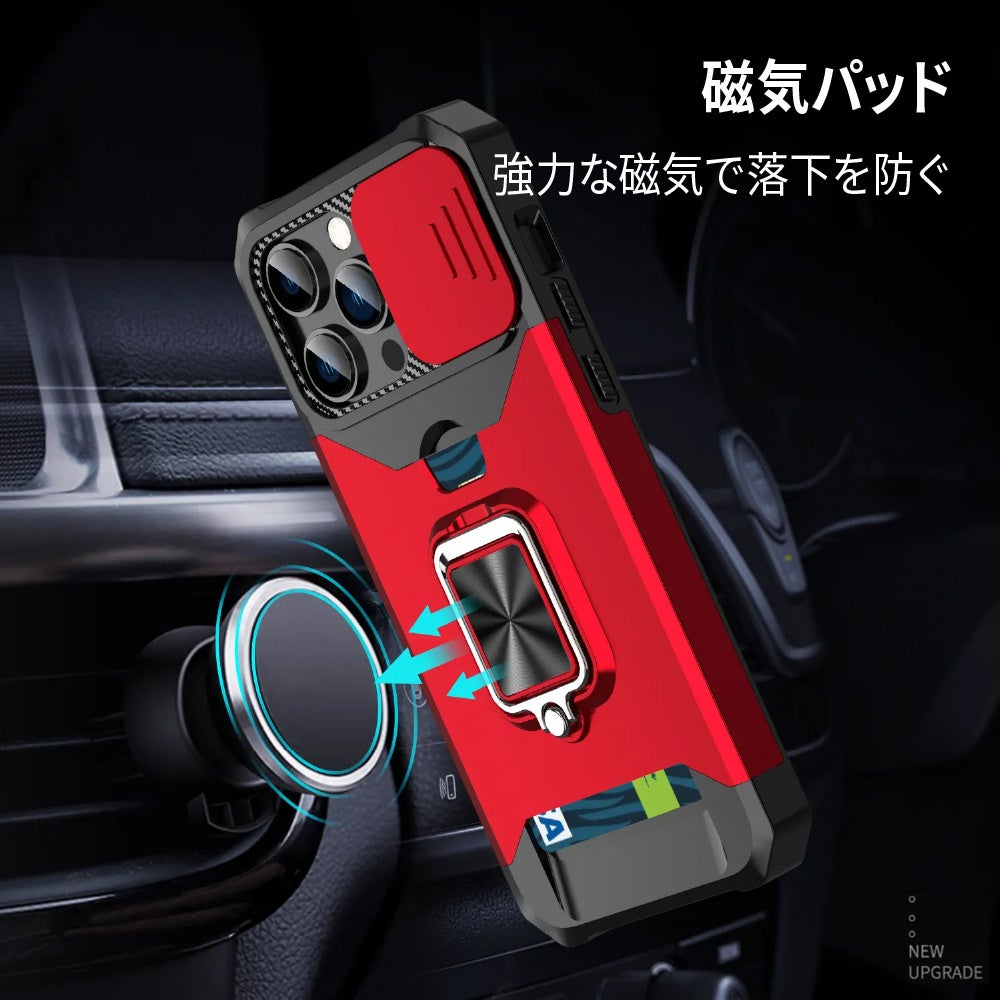 丈夫なPC素材を使用したボディに加え、磁気パッド・スマホリング・スタンド・カメラ保護スライドカバー・カードスロットが内蔵されています。
