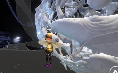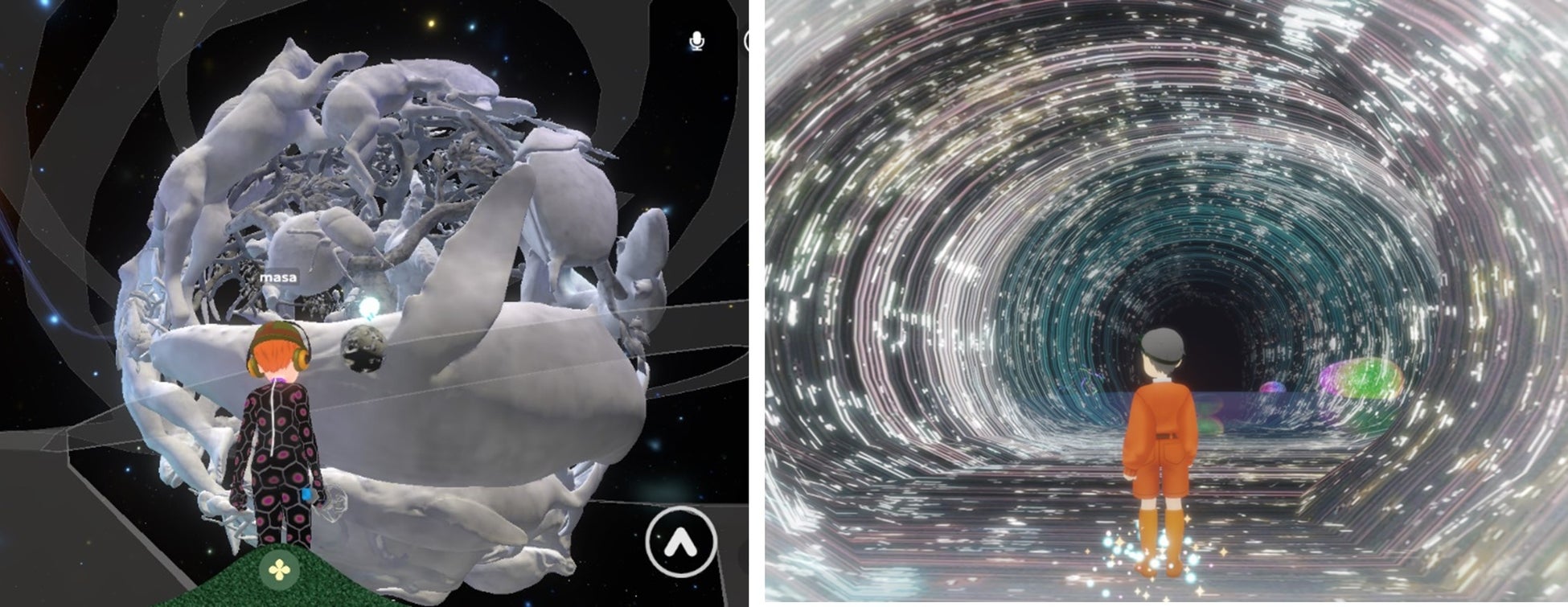 河森氏が生物多様性を合体・変形させた象徴として描いたオリジナルオブジェクト「いのち球」。実際のパビリオンでは高さ3.5メートルのモニュメントとして設置される「いのち球」が、バーチャル空間内では70メートルのスケールで登場。来場者は様々な生き物に変化しながら、多様な “いのち”でできた巨大な「いのち球」の周りをめぐり、頂上から球の内側へダイブ。リアルな「いのち球」では表現されていない、誰も見たことがない内側の世界に飛び込むバーチャルならではの表現で、いのちめぐる冒険を楽しむことができます。