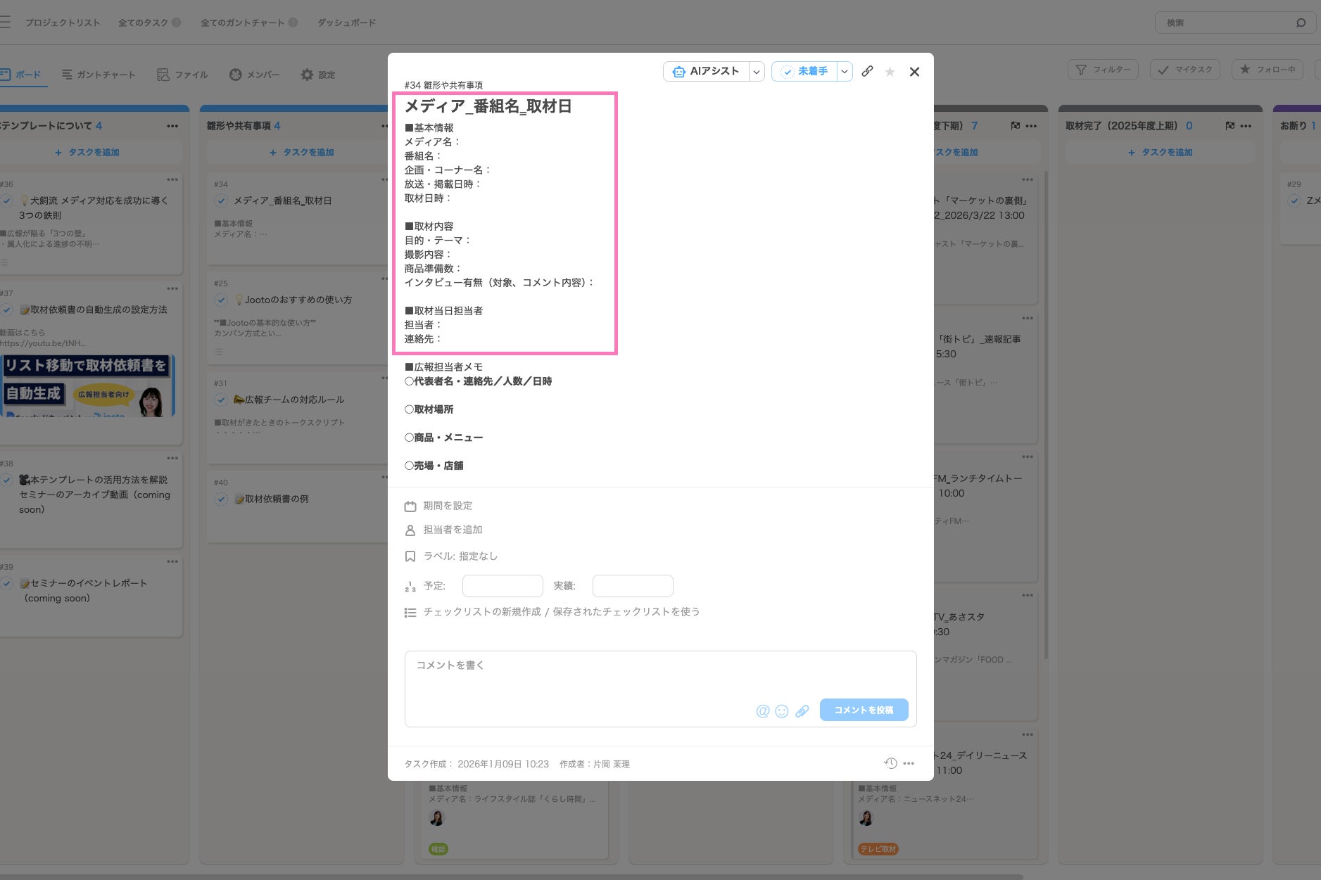 Jootoでは、誰でも手軽にタスク管理を始められる環境づくりを目指し、業務に即したテンプレートの拡充を進めています。今回の「有識者監修テンプレート」は、専門家の思考プロセスや業務フローを、誰でも一定再現可能な形でテンプレートに落とし込む取り組みです。広報業務のように属人化しやすく、社内外の調整が複雑な業務においても、タスクとして可視化・共有することで、チーム全体で進捗を把握しながら業務を進められる環境づくりを支援していきたいと考えています。今後も各領域の専門家の知見をテンプレートとして提供し、業務の標準化と生産性向上に貢献してまいります。